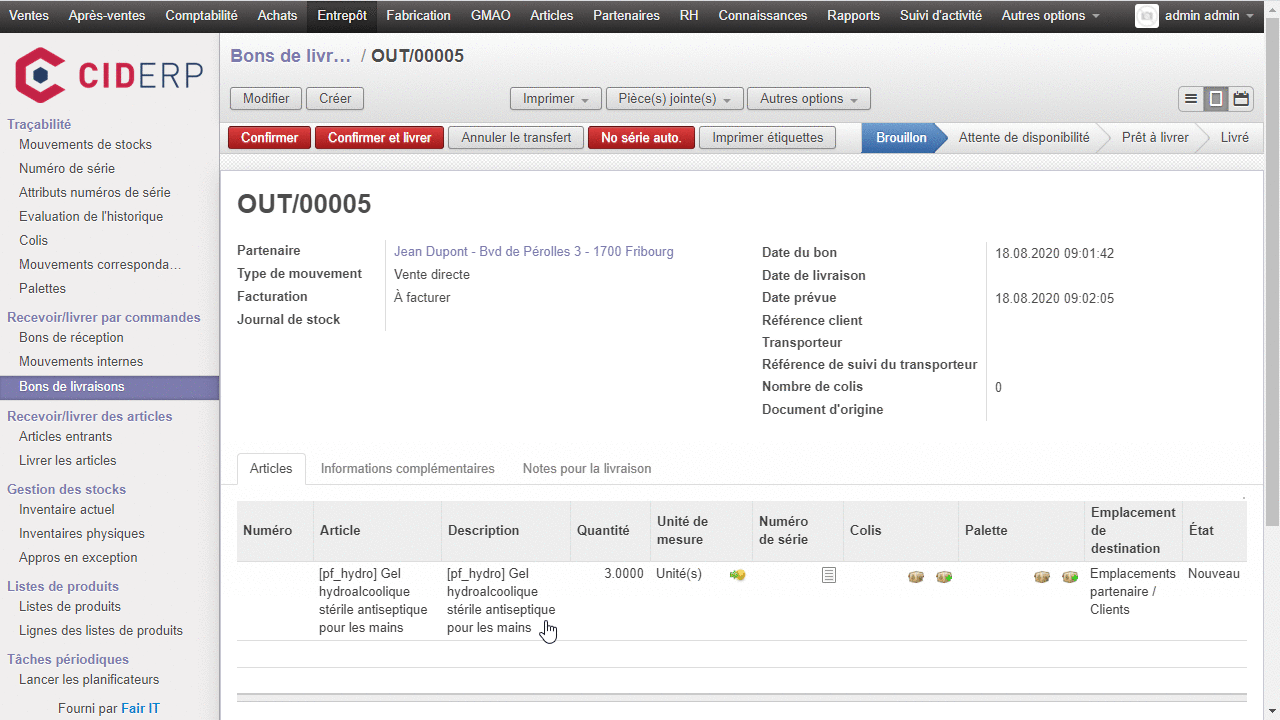 Un autre aspect de la traçabilité que CID ERP permet de gérer est le suivi des colis/palettes. Lors d’une livraison sortante, le logisticien peut générer des palettes (avec un numéro de traçabilité palette) qui contiennent des colis (avec leur propres numéros de traçabilité) qui eux-mêmes contiennent des articles numérotés en lot/série. Grâce à l’interface existante avec un système d’imprimante, des étiquettes peuvent être imprimées depuis le logiciel, contenant les informations de colis et de palettes.