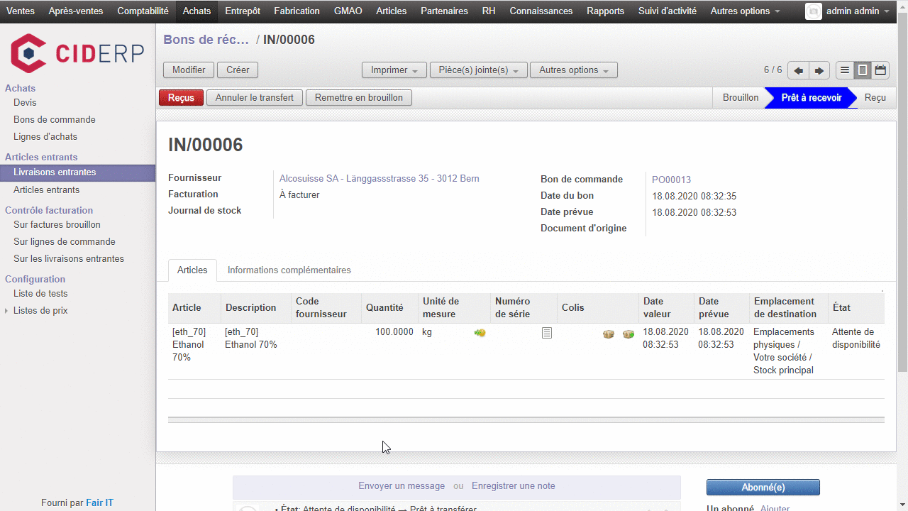 Consommation de matière - si la matière première est une composante de la nomenclature d’un produit transformé ou fabriqué, CID ERP offre la possibilité à l’utilisateur de réserver les numéros de lot/série automatiquement selon les critères FIFO. Le système va automatiquement consommer les lots les plus anciens. Au besoin, l’utilisateur peut modifier lui-même les numéros de lot/série.